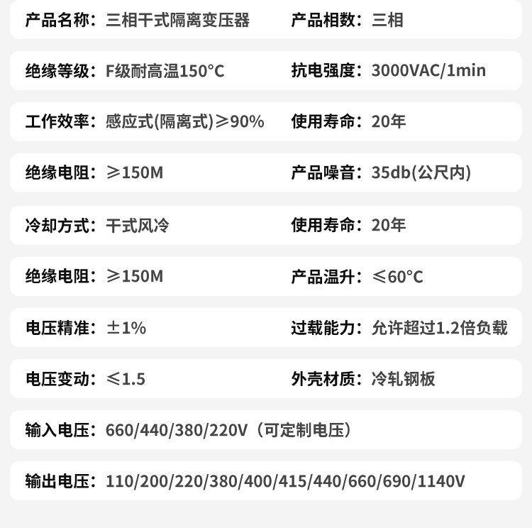 变压器是用于在不改变频率的情况下将一种形式的交流电能转换为另一种形式的交流电能的电机。隔离变压器是一种用于将隔离的交流电传输到装置或设备以实现安全、保护或减少谐波和瞬态电压浪涌的变压器。它基于电流隔离在受电设备和电源之间提供隔离,其中电源和受电设备之间没有导电路径。 隔离变压器用于安全目的,也用于减少瞬态和谐波。它提供电流隔离。这意味着源和负载之间不存在导电路径。